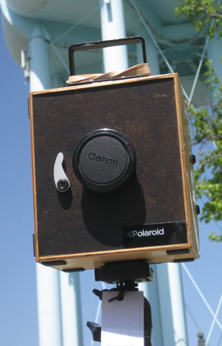 ” A modified enlarger bellows was made into a pinhole camera w/ variable focal lengths and 4×5 backs. It is adapted to use b&w paper or film. This image was made on RC photo paper.””